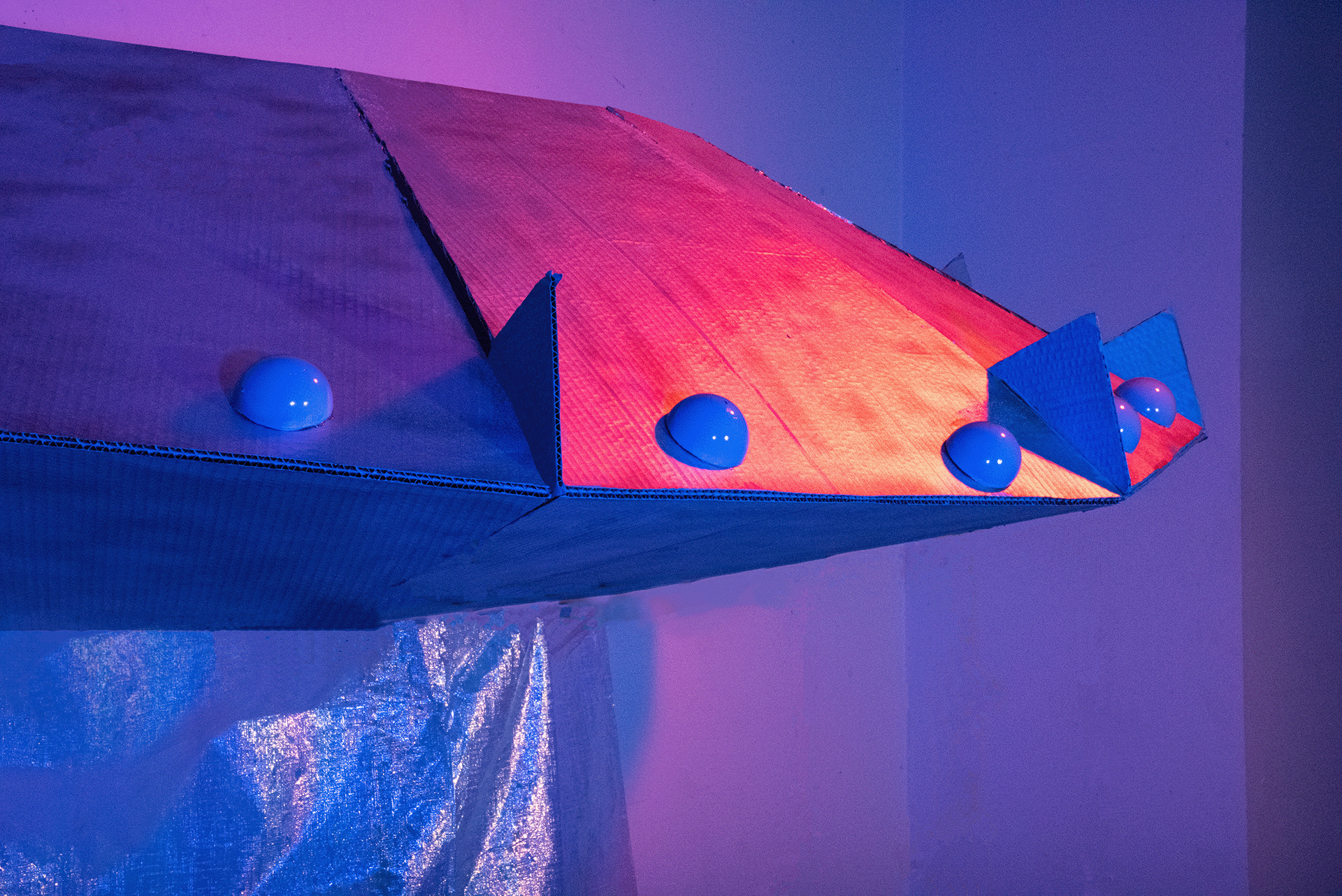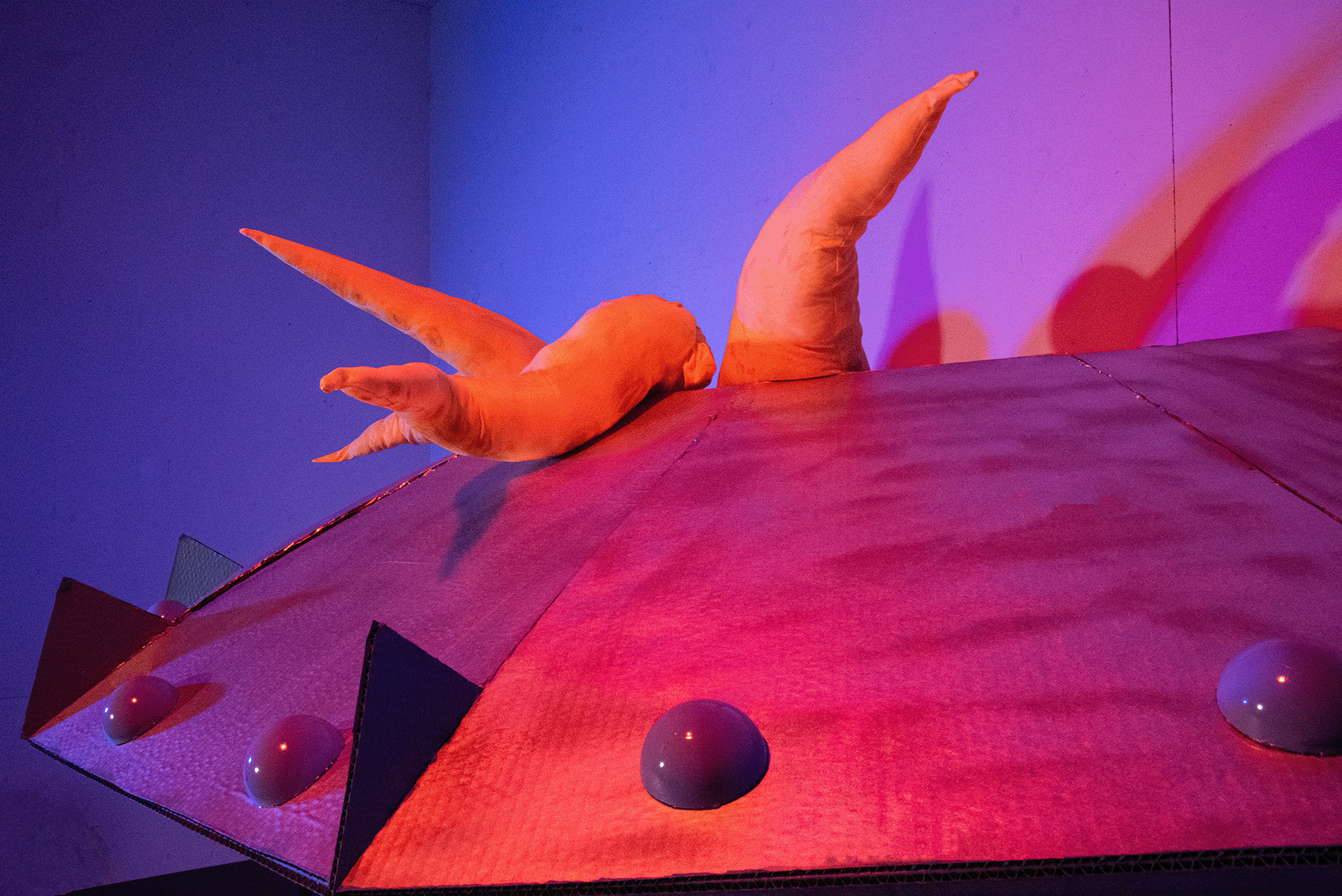 Interactive elements: human sized spaceship, a mobile filter, and tentacles in the space.