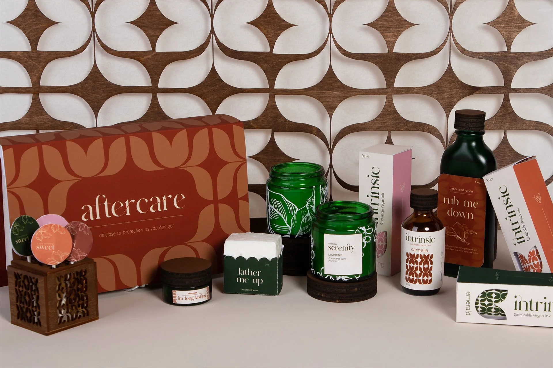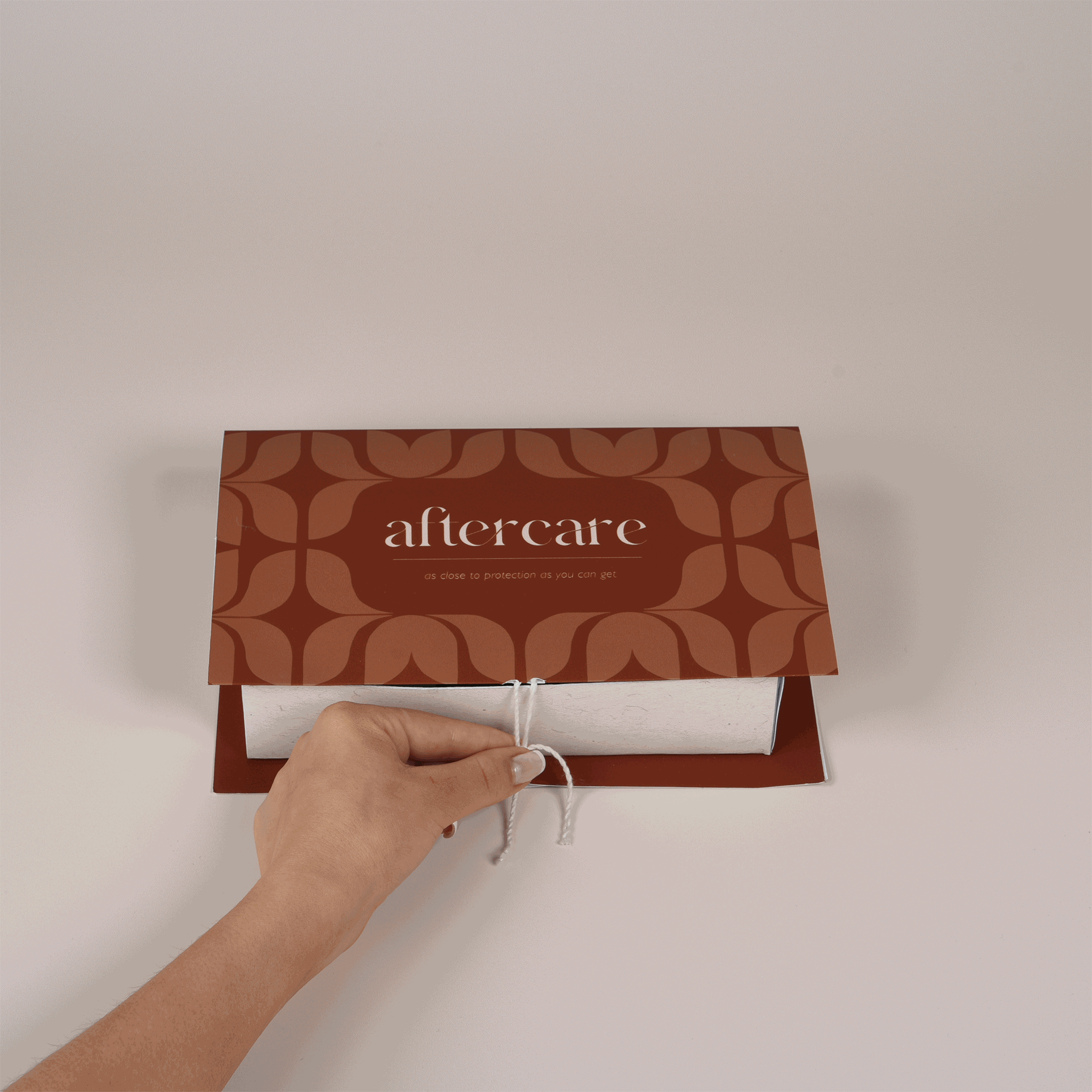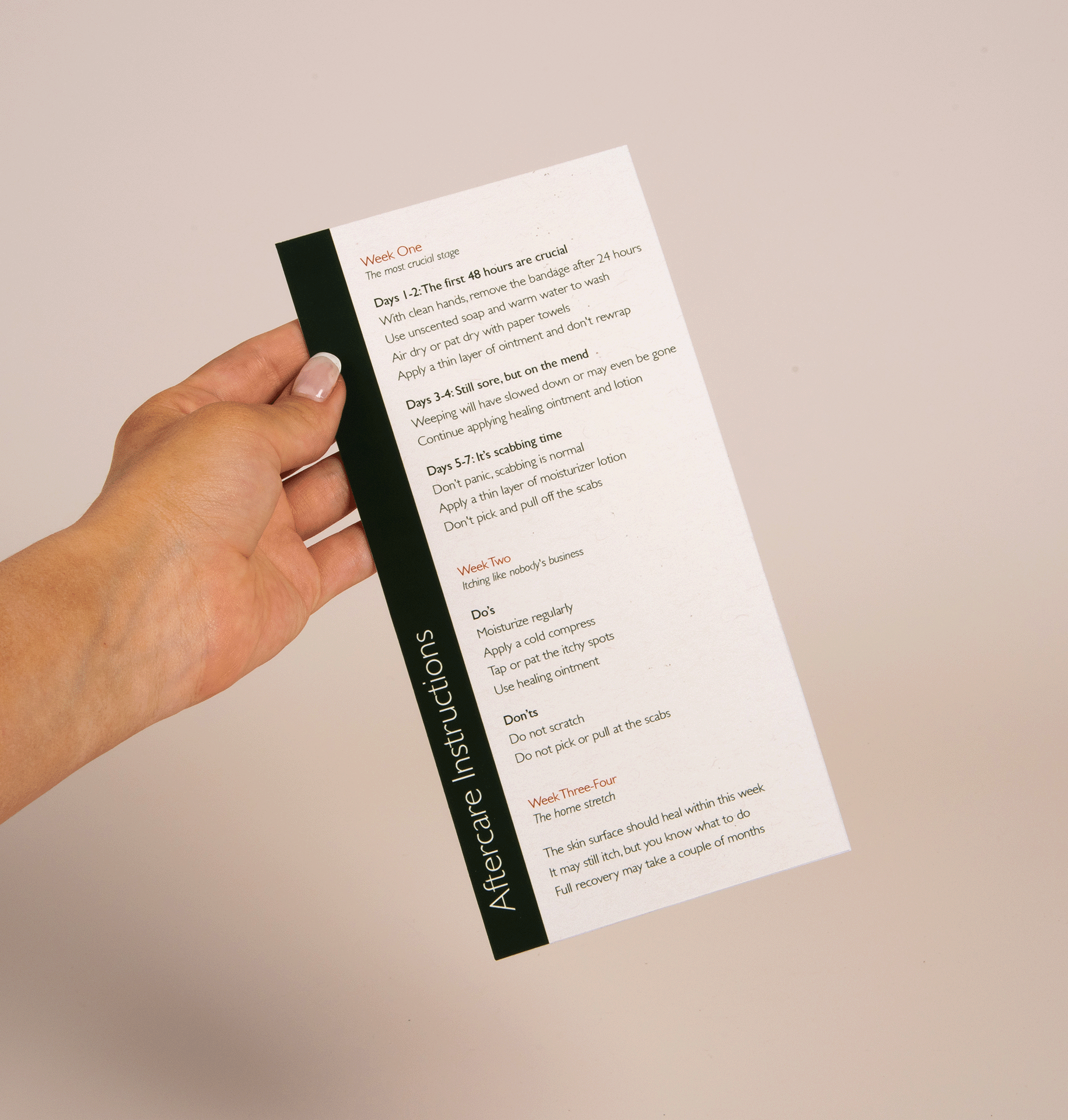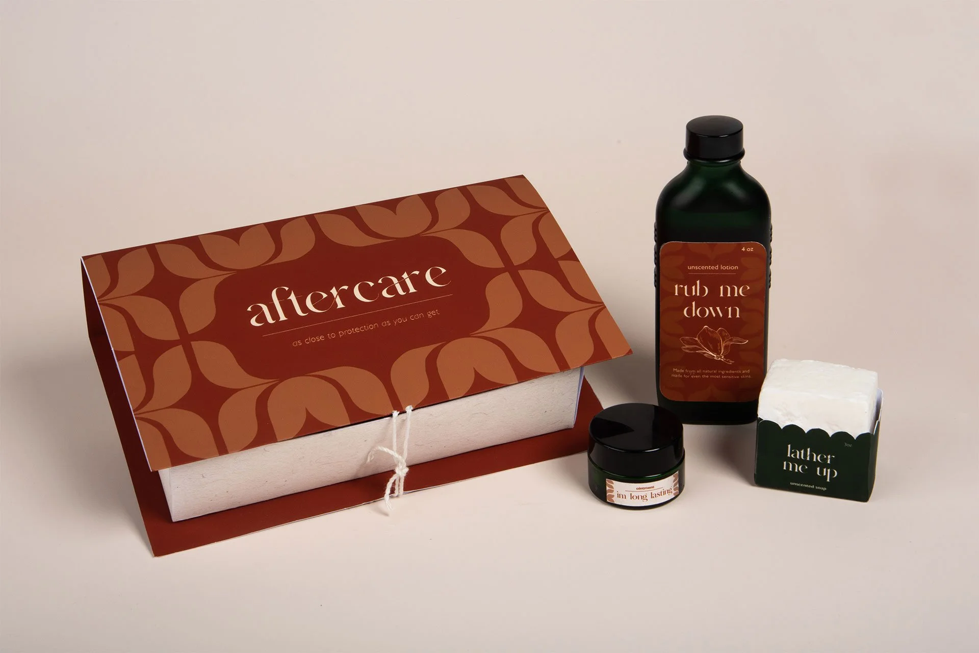 The aftercare box includes: instructions, unscented soap, lotion, and ointment.