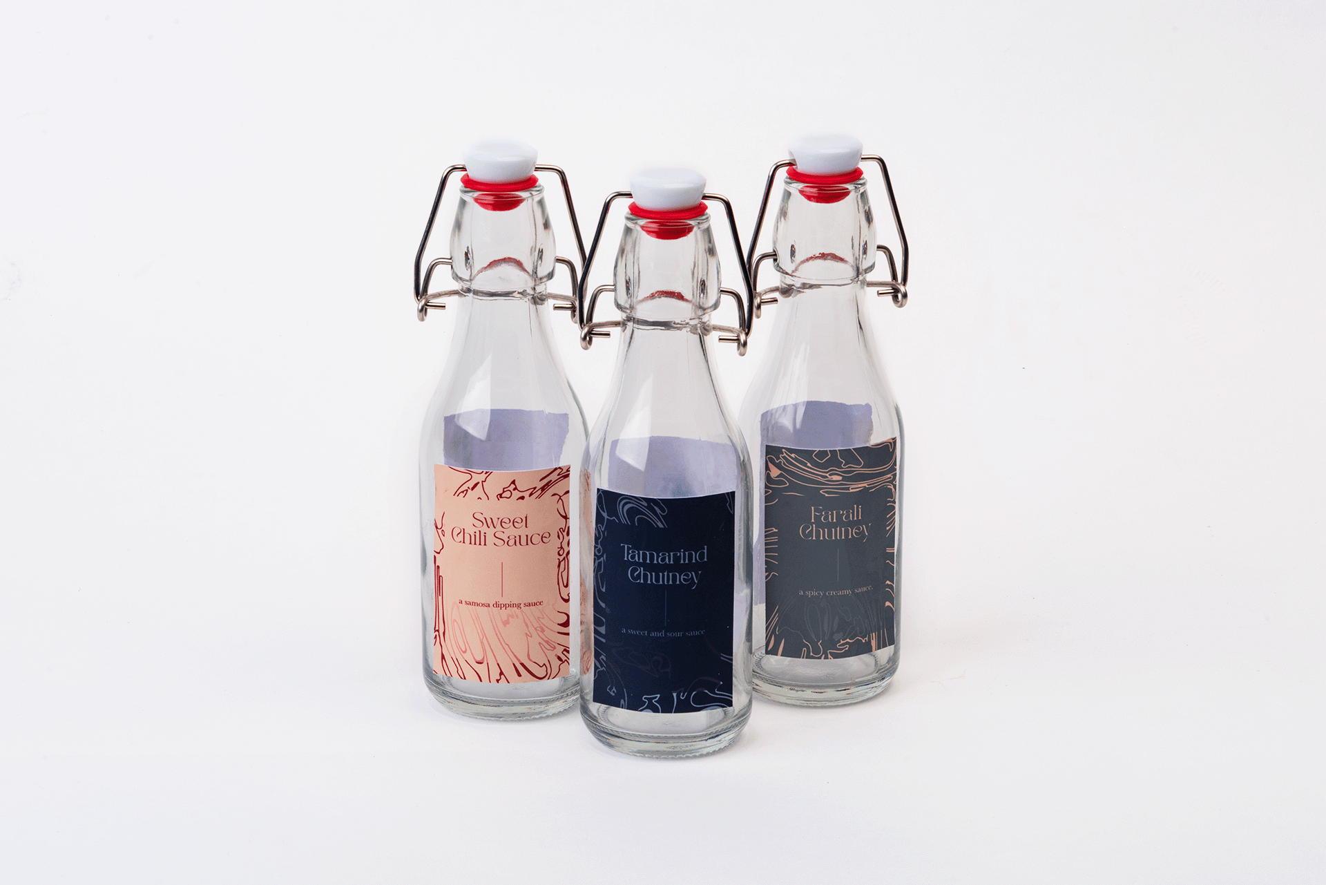 Sauce bottles include three sauces that are offered at Pavilion with naan before the meal.